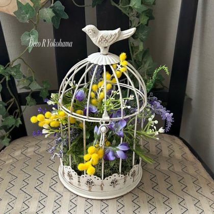 白いアンティーク調の鳥かごからミモザが溢れ出す、遊び心たっぷりのデザイン。